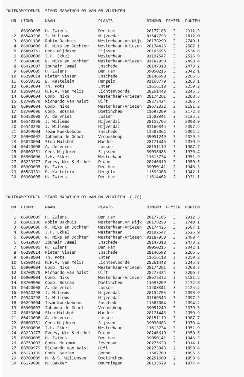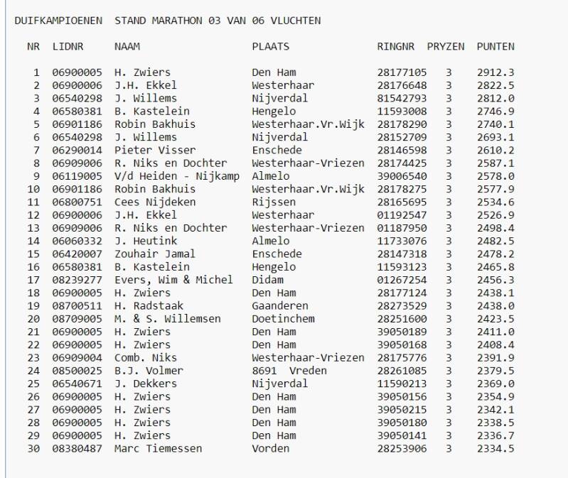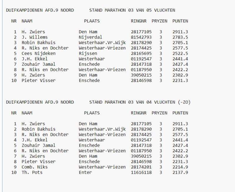 Eindstand 7e Asduif Marathon Afdeling 9 Oost Nederland 2024