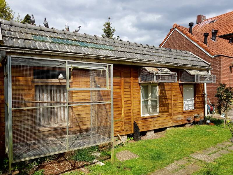 Linkse Afdeling 10 koppels met de ren ervoor, midden de weduwnaars 12 stuks, rechts de weduwduivinnen 12 stuks, met 1 of 2 kweek koppel erin, zodat er geen onderlinge paringen kan ontstaan.